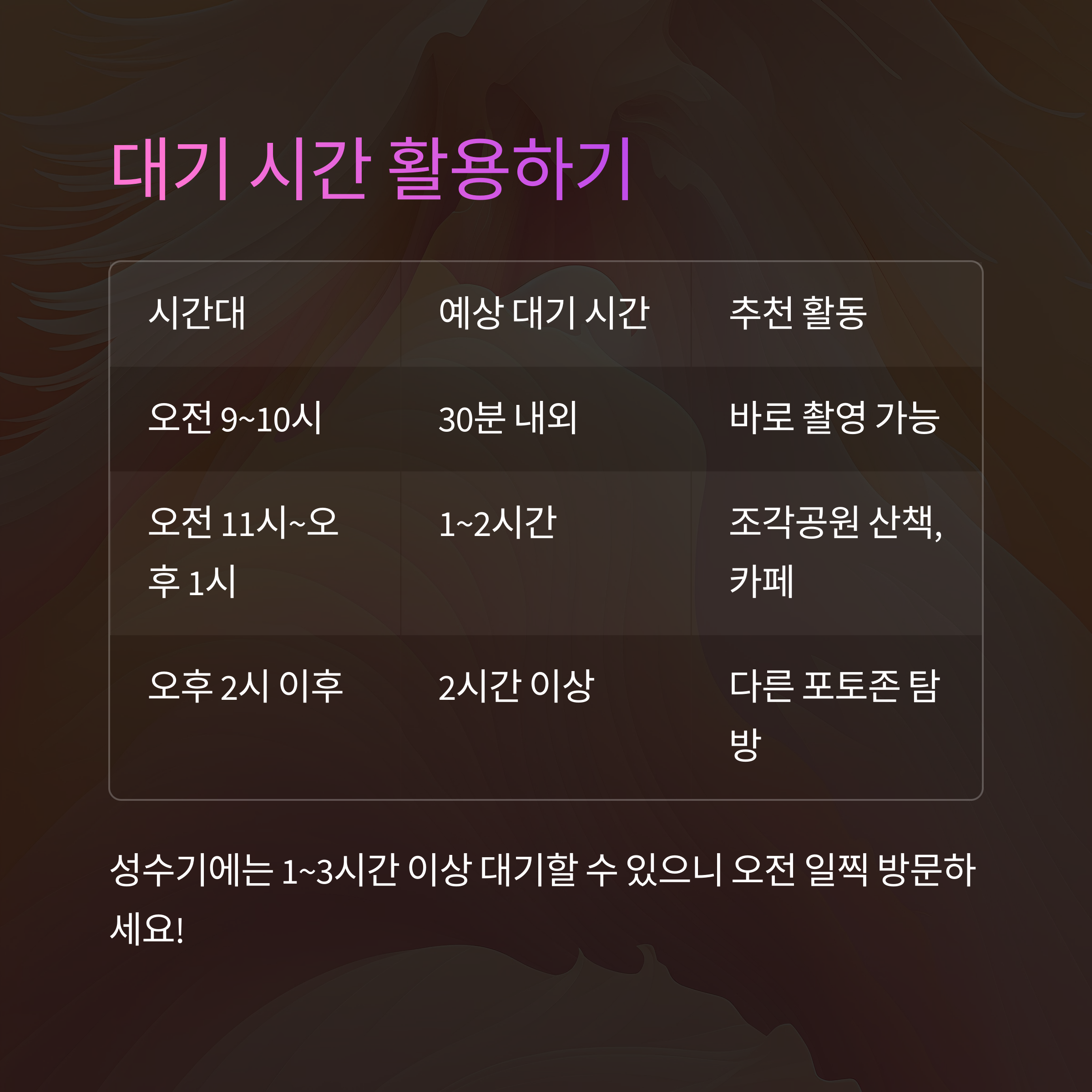 | 오후 2시 이후 | 2시간 이상 | 전경 촬영, 다른 포토존 탐방 |