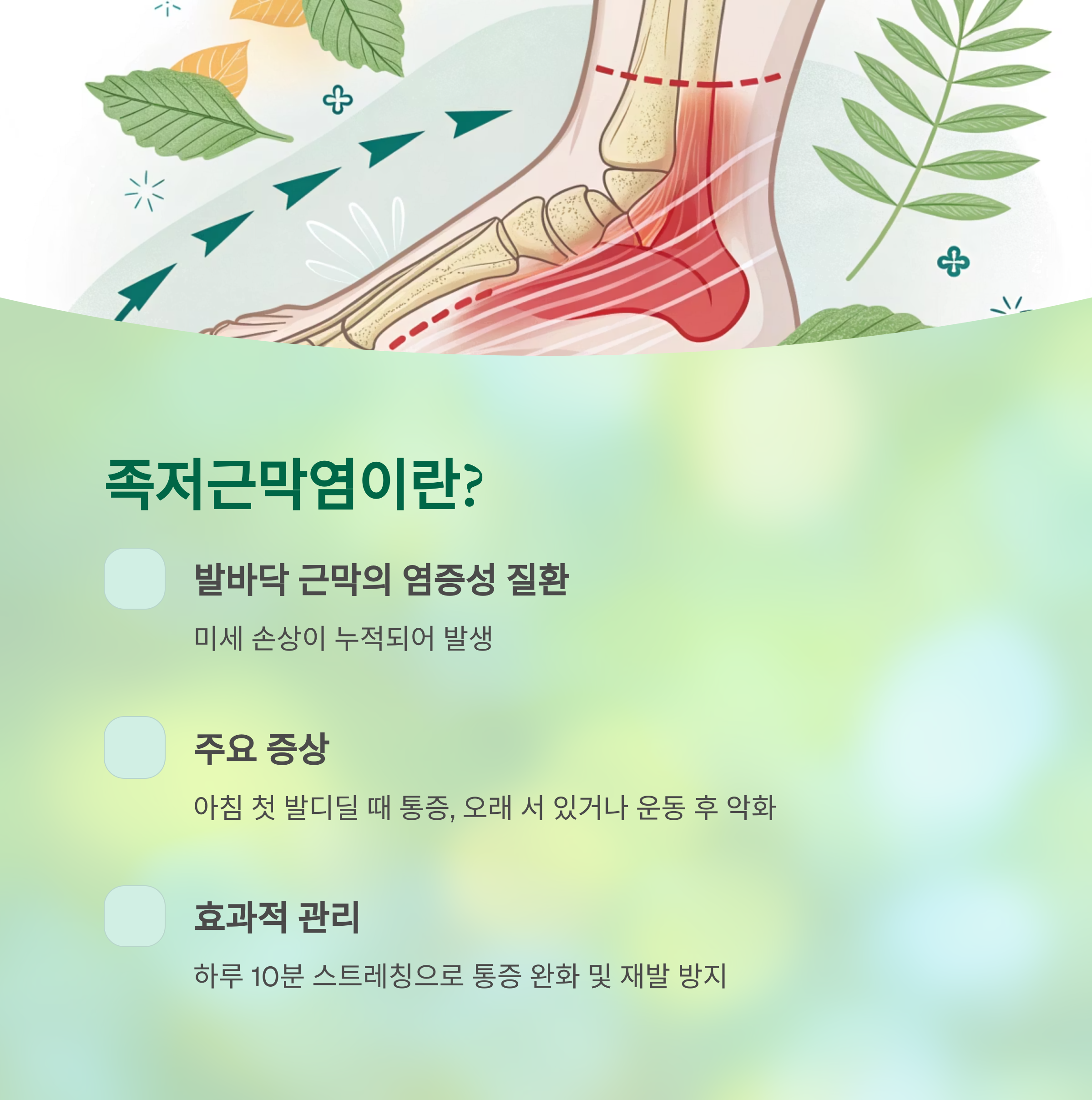 족저근막염은 발바닥의 근막에 미세한 손상이 누적되며 발생하는 염증성 질환입니다.