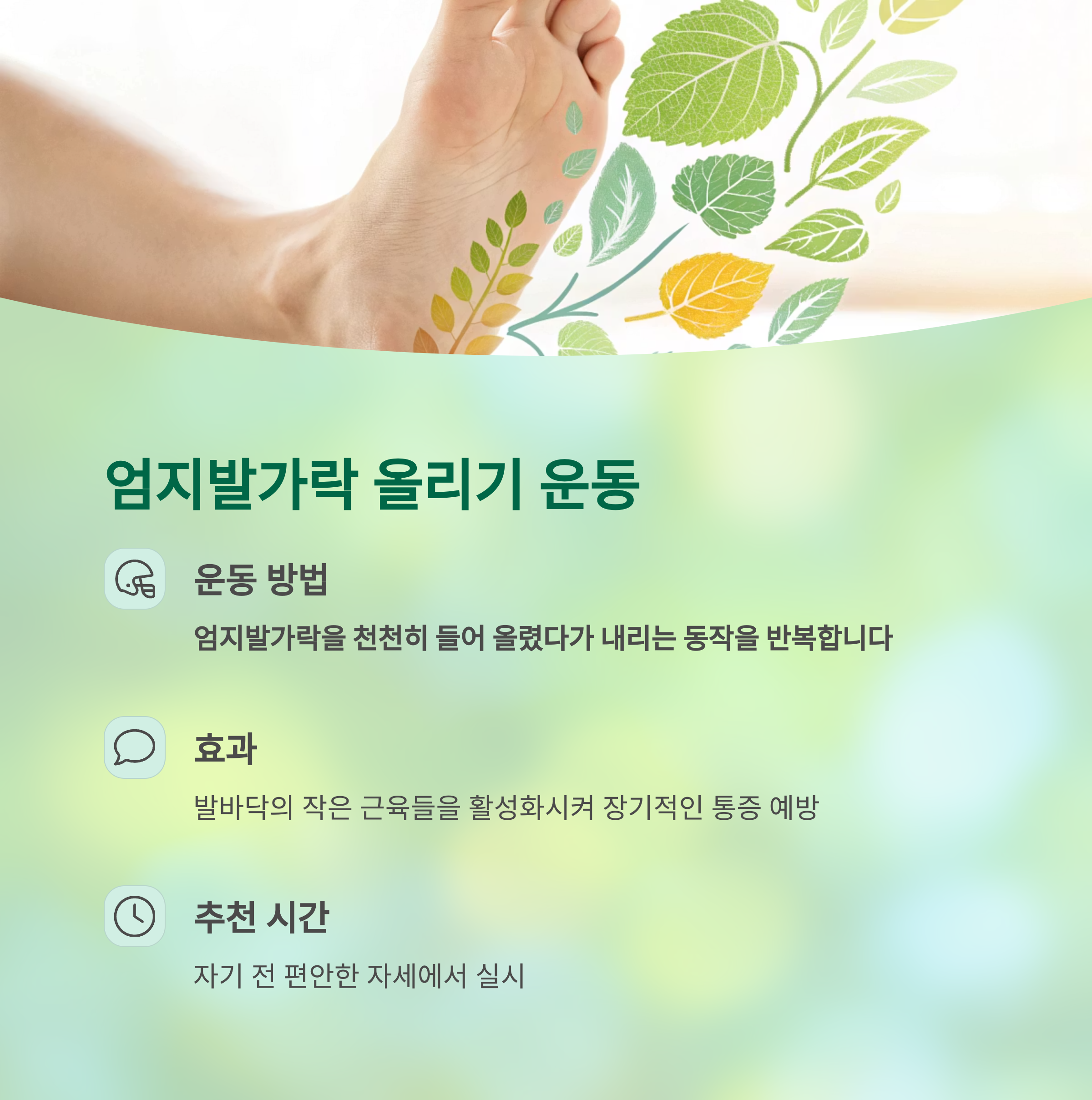 | 자기 전 | 발 마사지, 엄지발가락 올리기 | 근막 이완 및 수면 질 향상 |