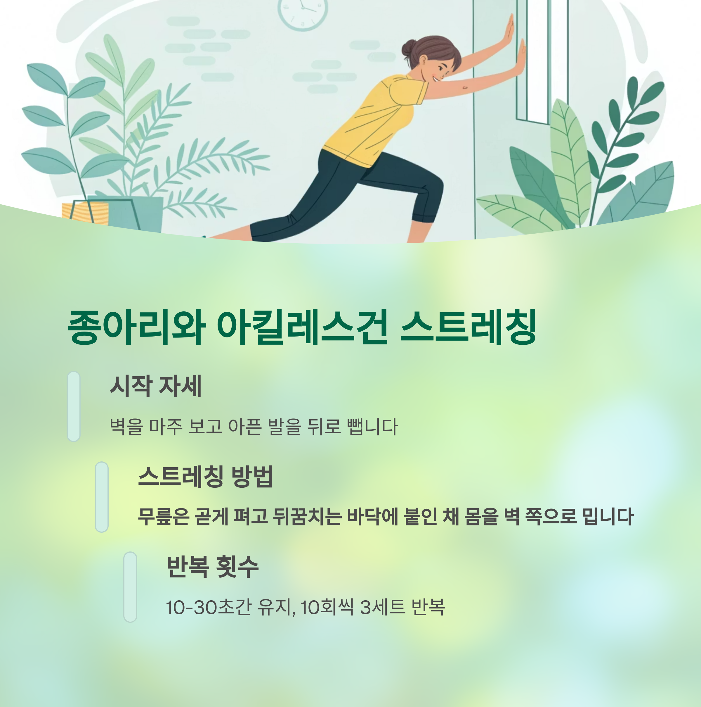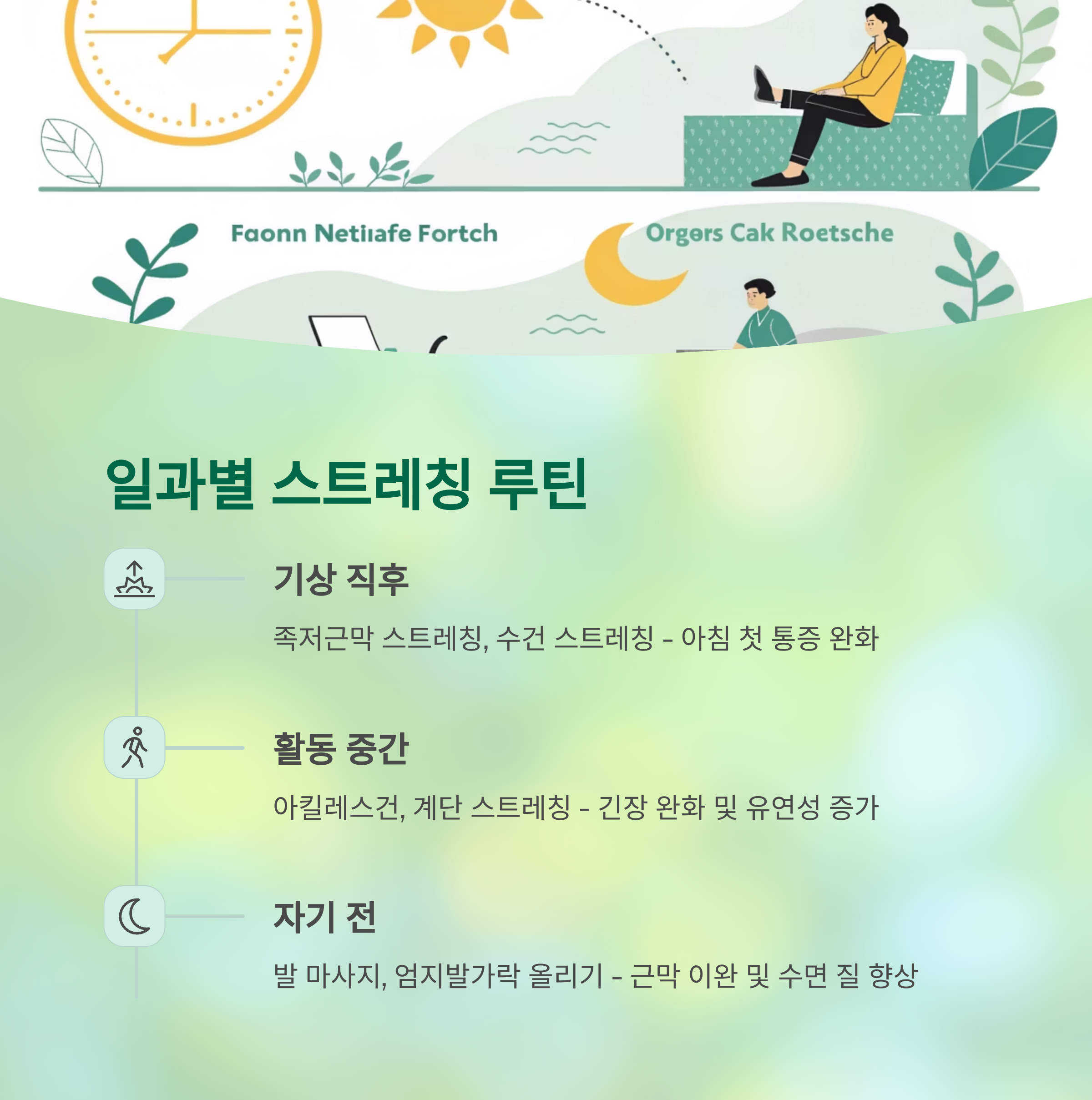 | 기상 직후 | 족저근막 스트레칭, 수건 스트레칭 | 아침 첫 통증 완화 |