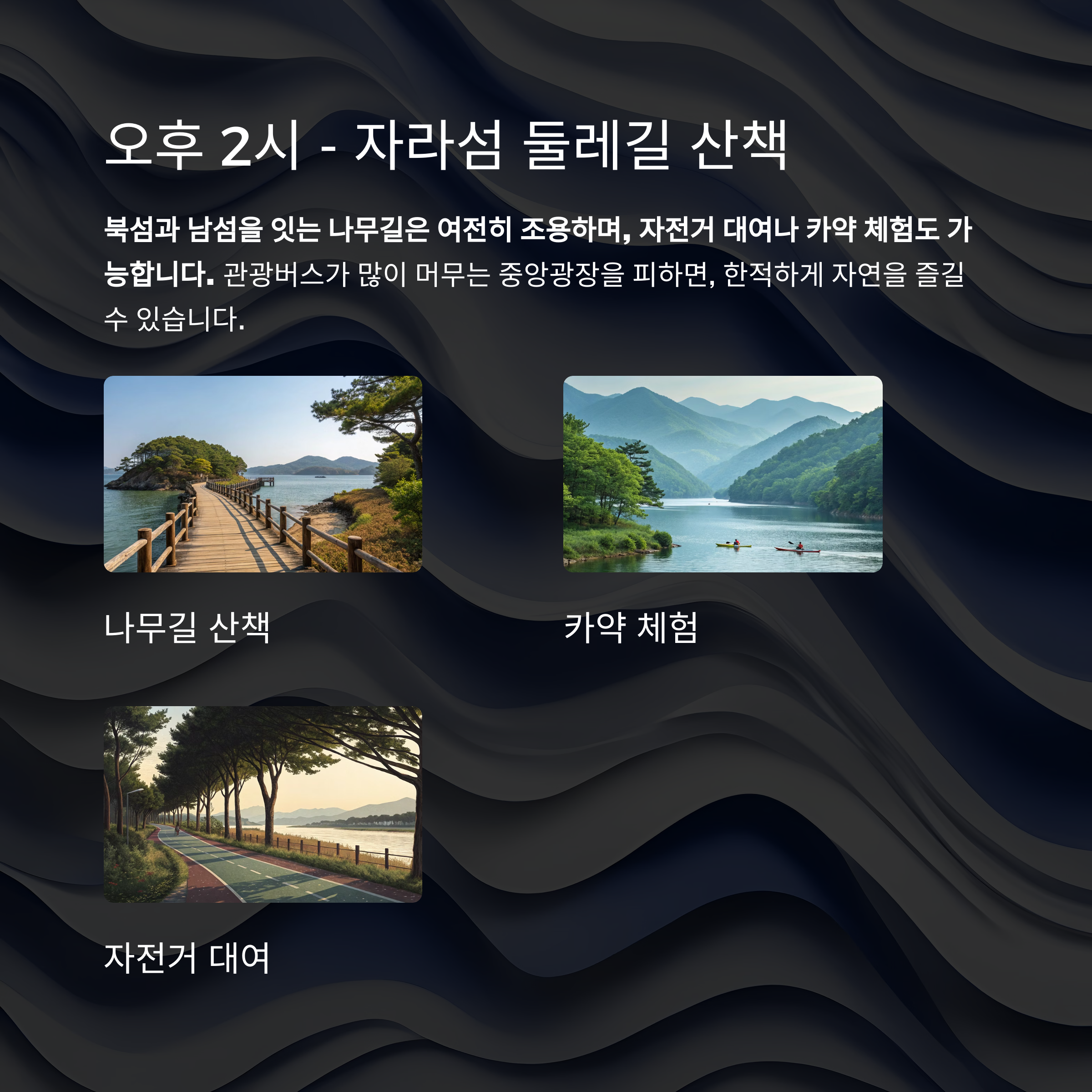 북섬과 남섬을 잇는 나무길은 여전히 조용하며, 자전거 대여나 카약 체험도 가능합니다.
