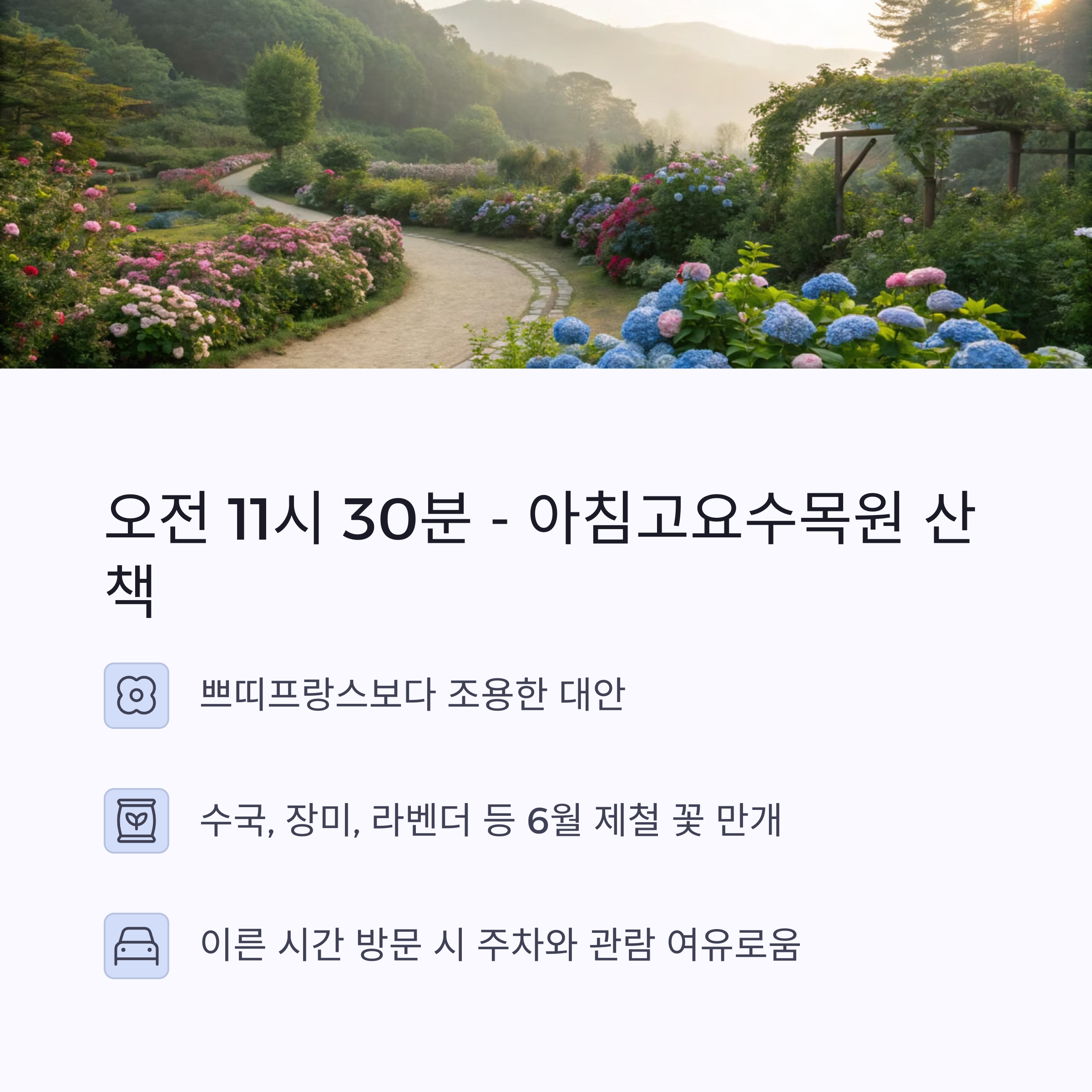 | 오전 11시 30분 | 아침고요수목원 | 꽃 감상 | 감성, 정적 |