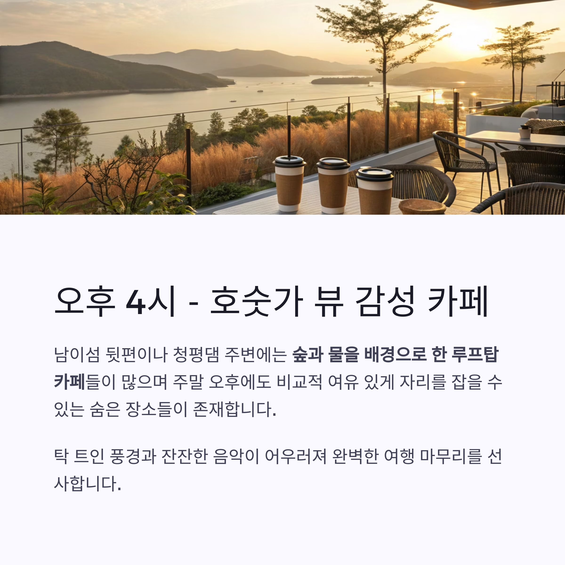 | 오후 4시 | 청평호 카페 | 커피 타임 | 호수 뷰, 힐링 |