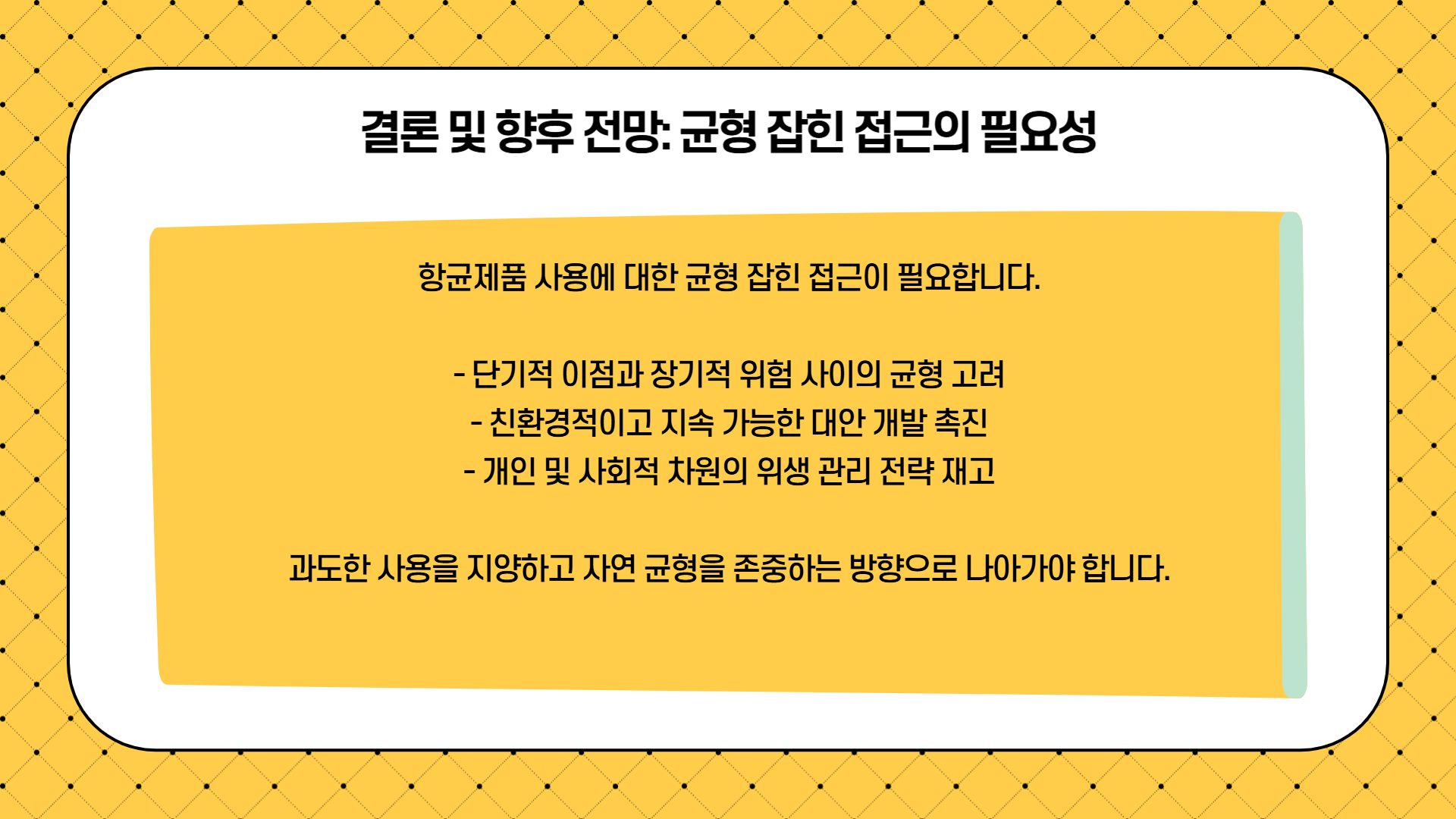 항균제품은 분명 위생 관리에 효과적인 도구이지만, 무분별한 사용은 오히려 건강한 박테리아 균형을 해칠 수 있습니다. 우리 몸은 완벽한 멸균 상태보다도, 유익한 균과의 공존을 통해 건강을 유지합니다. 일상 속에서 현명하게 항균제품을 사용하고, 내 몸의 미생물 생태계를 보호하는 습관을 가져보세요.